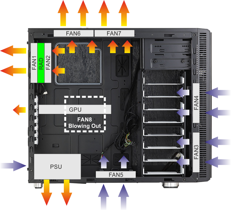 Im doing a small referesh / tidy on my PC, and from posts i made yesterday i ordered an Ocuk gtx970 plus an EVGA PSU.. At the moment my PC sounds like a powerstation, all the fans are 3 pin (i only have 1 4 pin on mb and the water coolers using that with a 3 pin header) fan layout is below. there is also a side fan with the dotted line blowing out. The gpu currently is blowing in the case but my new OCUK blows out as indicated. Is there anyway i can thermostatically control the fan speeds so they crank up on their own when needed (Aside from CPU), I have one 5.25 bay free if that helps.