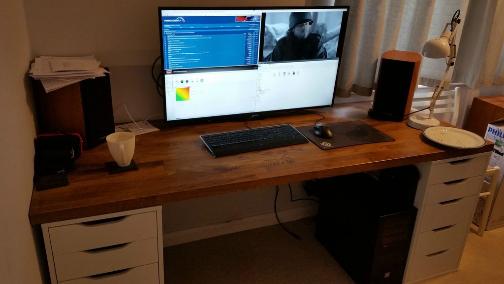 Well the Philips arrived, here it is on my desk mounted to bricks with a cheap wall arm from Amazon (since the stand has absolutely no adjustments):