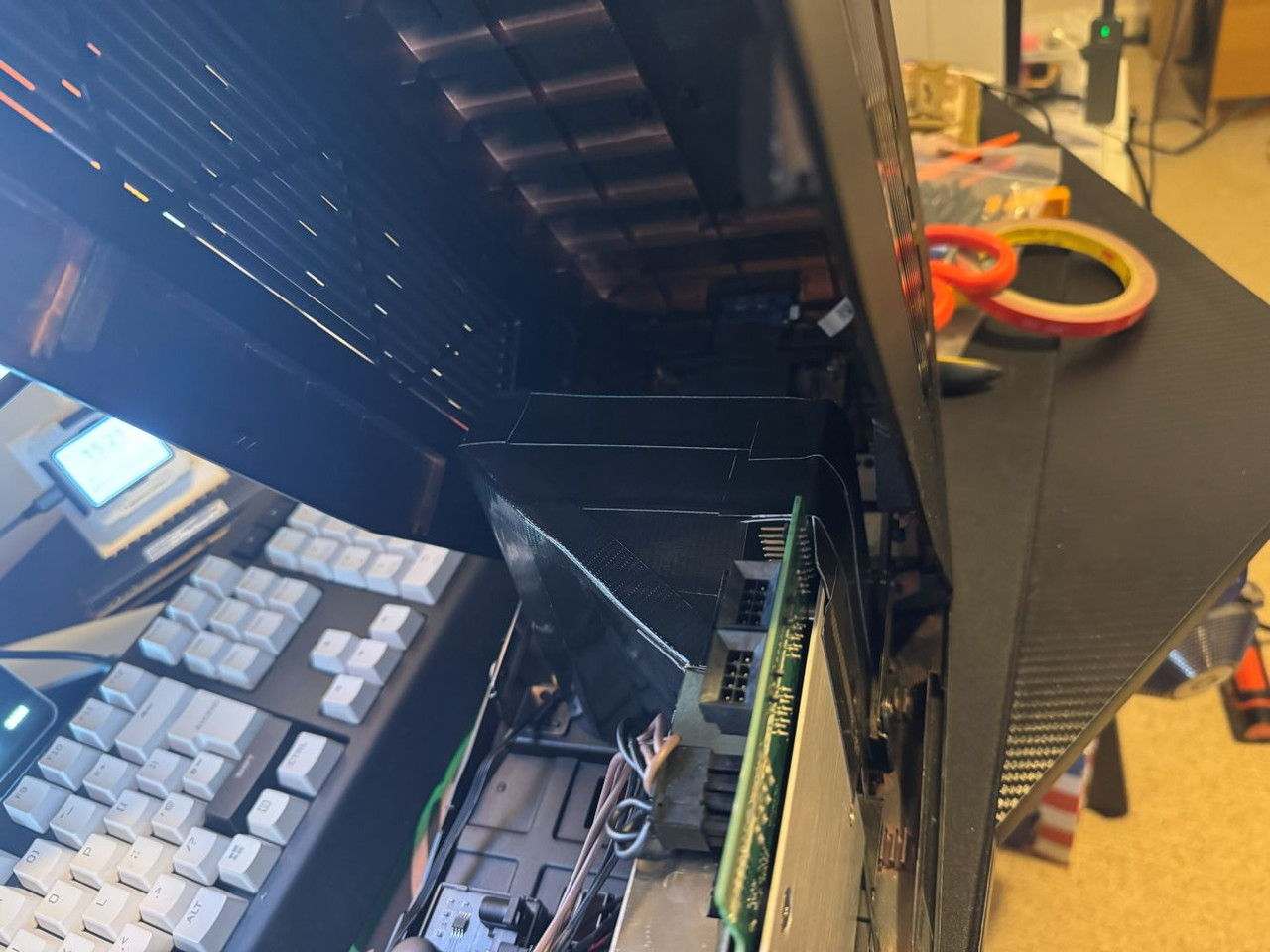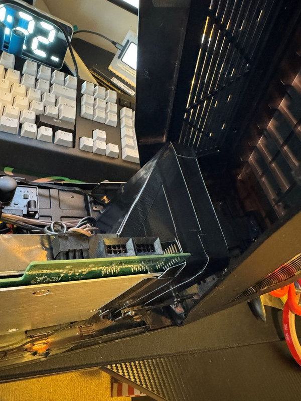 Those of you who had your money on that puny Noctua not being up to the task? were correct. So I machined two pieces of plastic, glued them to the floor then VHB a larger fan onto those.