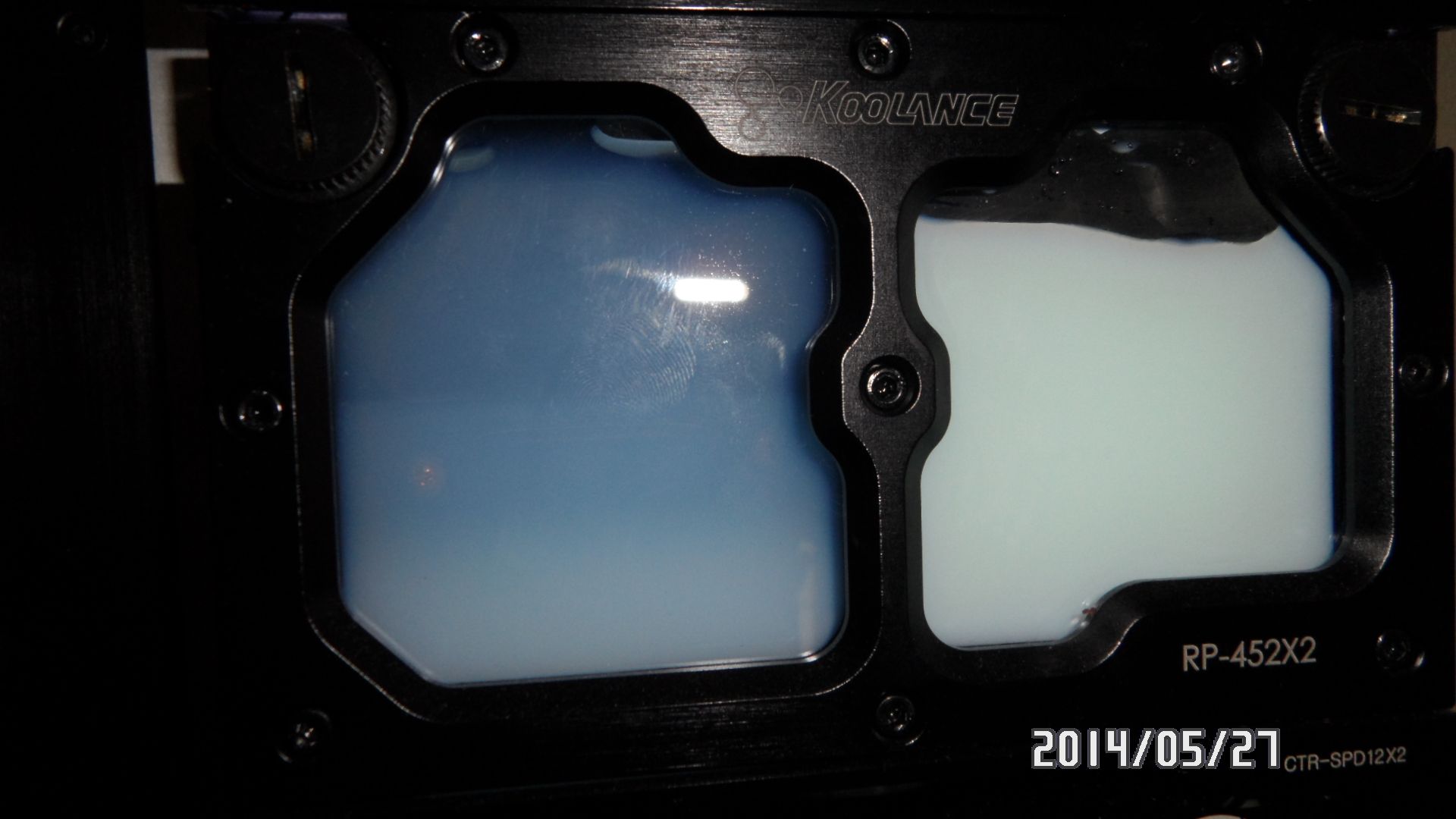 I have a Koolance RP-45X2 dual res running 2x D5's in parallel and as you can see from the pic in the left chamber the mayhems ice white nano fluid is breaking down into 3/4 layers, both pumps are working and i have contacted koolance to check that i have it set up right and they say i do and the reason why its happening is there is no turbulence in that side of the res.