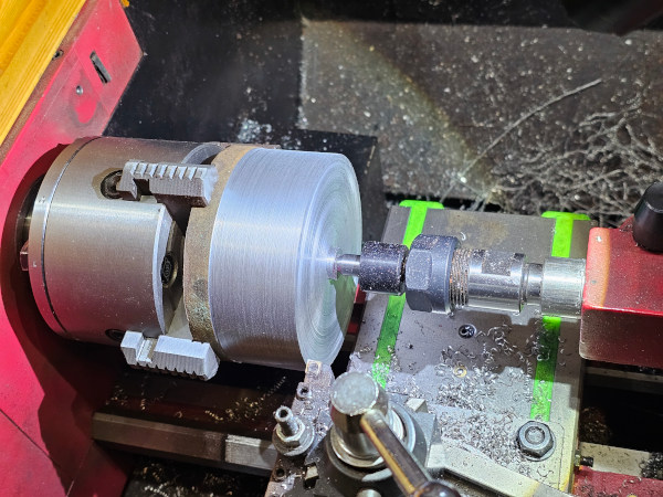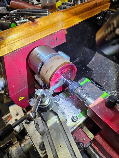 Mounted, trued up, painted red and facing off the end. This is where it bit me. The diameter here is 100mm so with larger diameters, the outer edge (the diameter) is moving faster for any amount of rpms than a smaller diameter bar is. So you can spin a 10mm bar at 1,000+ rpm and face off the much smaller end in a flash but try that on this and things will break....in your face! So this was running just a tad over 200 rpm and because of my nasty hack-job was a horribly interrupted cut. It's flat when all the red is gone (it's easier to see when it's spinning) and as you can see, there's only a band of silver being cut at each rotation. So that basically smacks into the tool every time it comes round. That rather limits the depth of cut you can take if you don't want the carbide insert shattering in your face...which I don't! Also on the issue of paranoia vs prudence, the four-jaw chuck wasn't technically necessary for this as it doesn't need to be carefully centred or put deliberately off-centre....but an extra jaw's an extra jaw stopping several kilos of steel breaking loose in my general direction. Similarly the tail support isn't necessary....but I really want it to stay put while it's thunking against the tool!