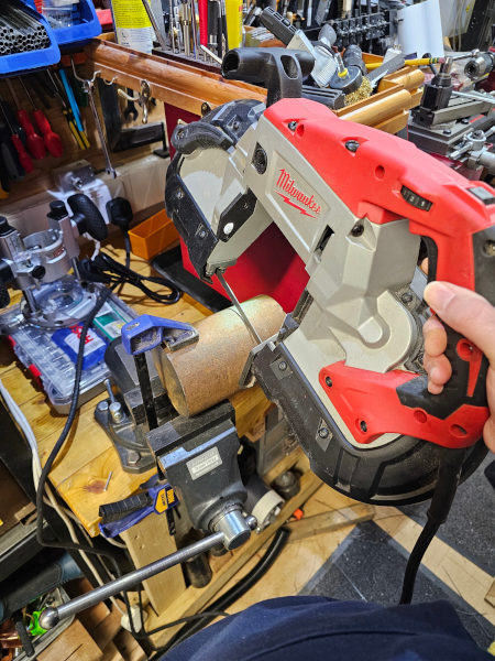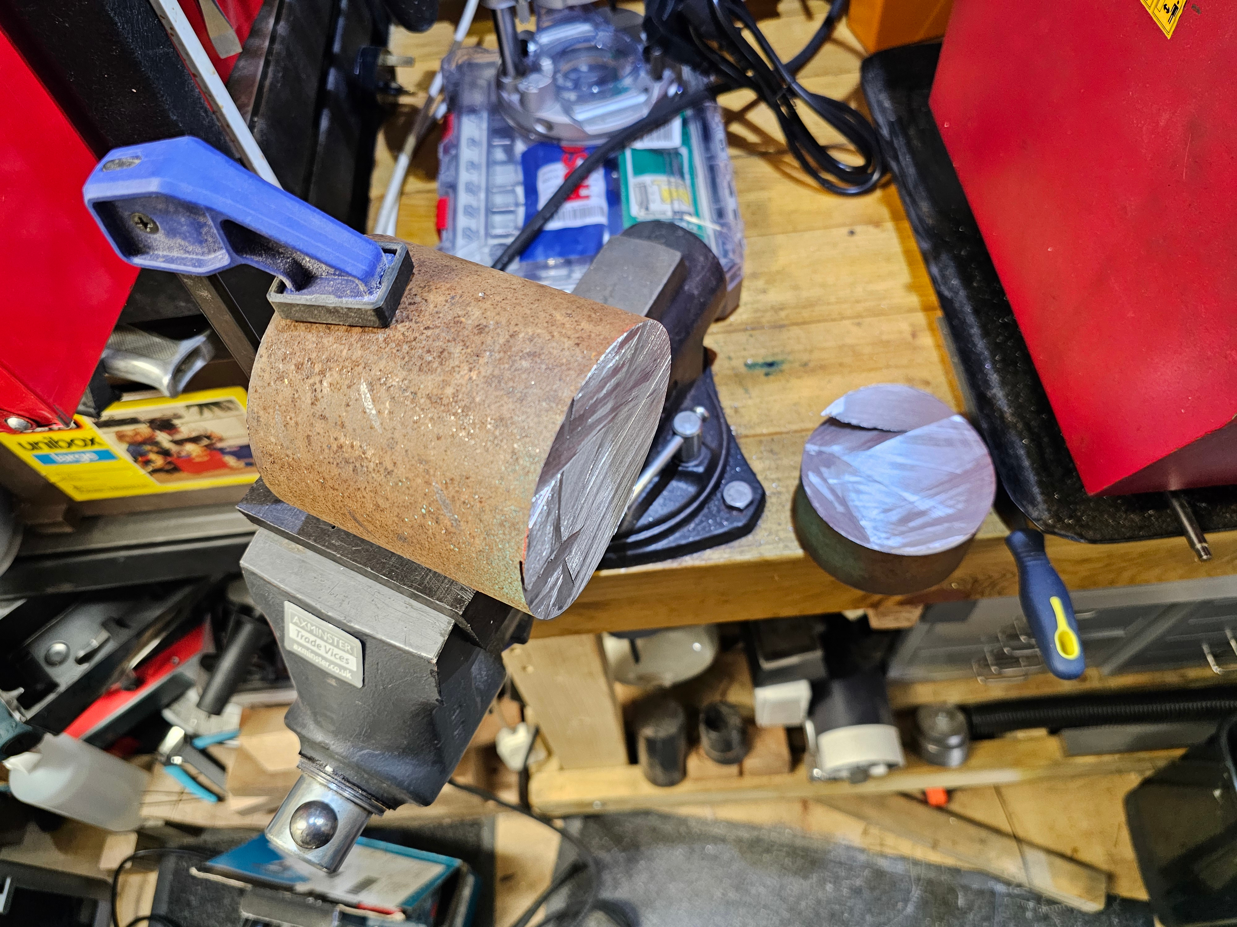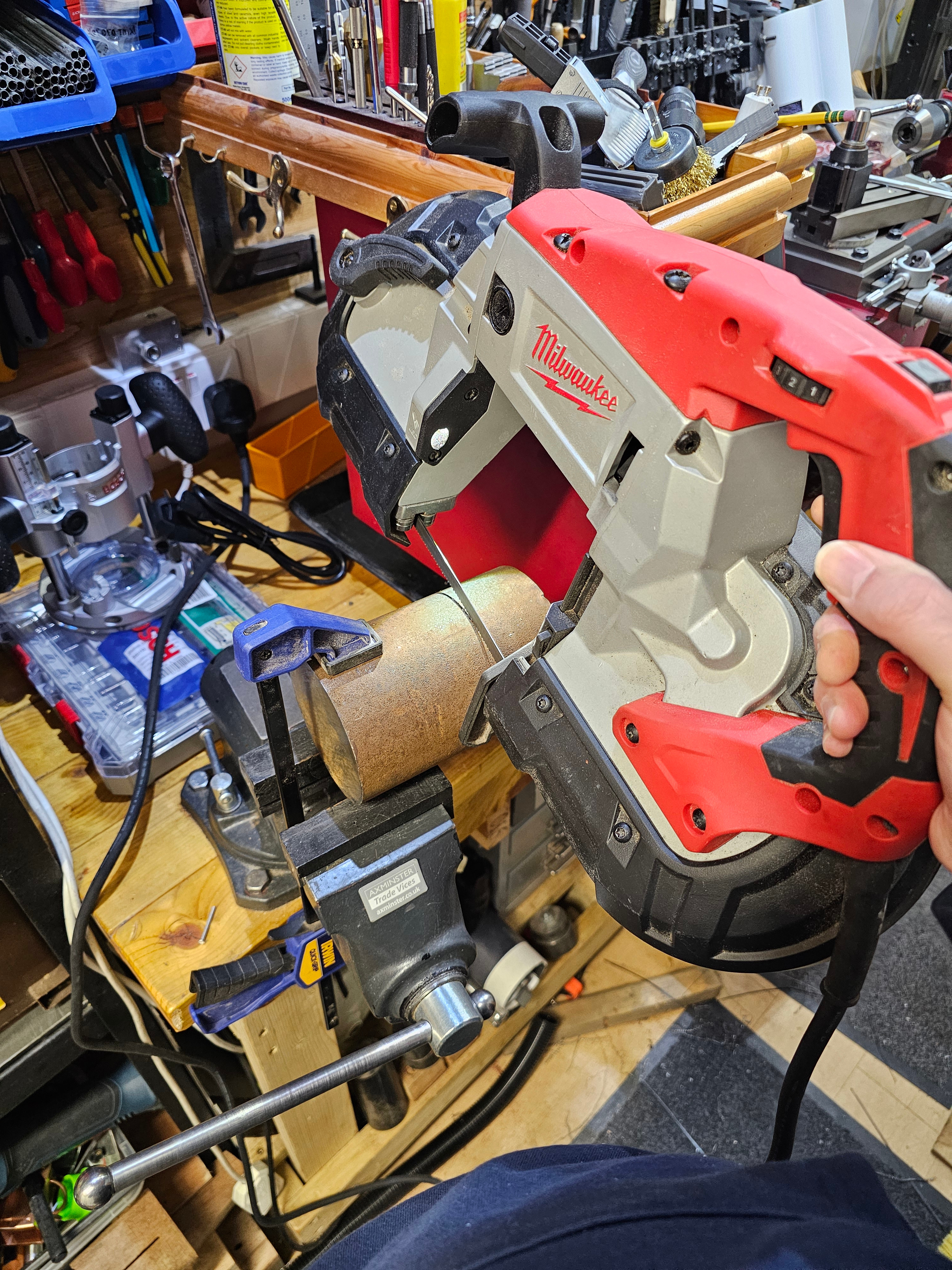 Also didn't like the idea of cutting it by hand so I went rummaging in the loft for the bigger bandsaw!That's not how you use a vise stupid! Yeah, well it worked didn't it?! It did technically fit in the jaws if I removed the 3D printed softjaws but it was so damn heavy that it would only have stayed put if I'd clamped down on it hard enough to leave bit marks in the end. This way I get three points of contact and no marring.