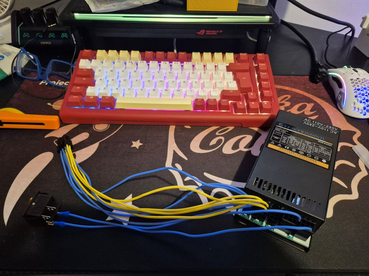 Tomorrow I shall continue wiring. I need to remove 22 of the 24 pin connector wires and fit a proper switch. Right now I am using an EVGA PSU starter thingermajig.